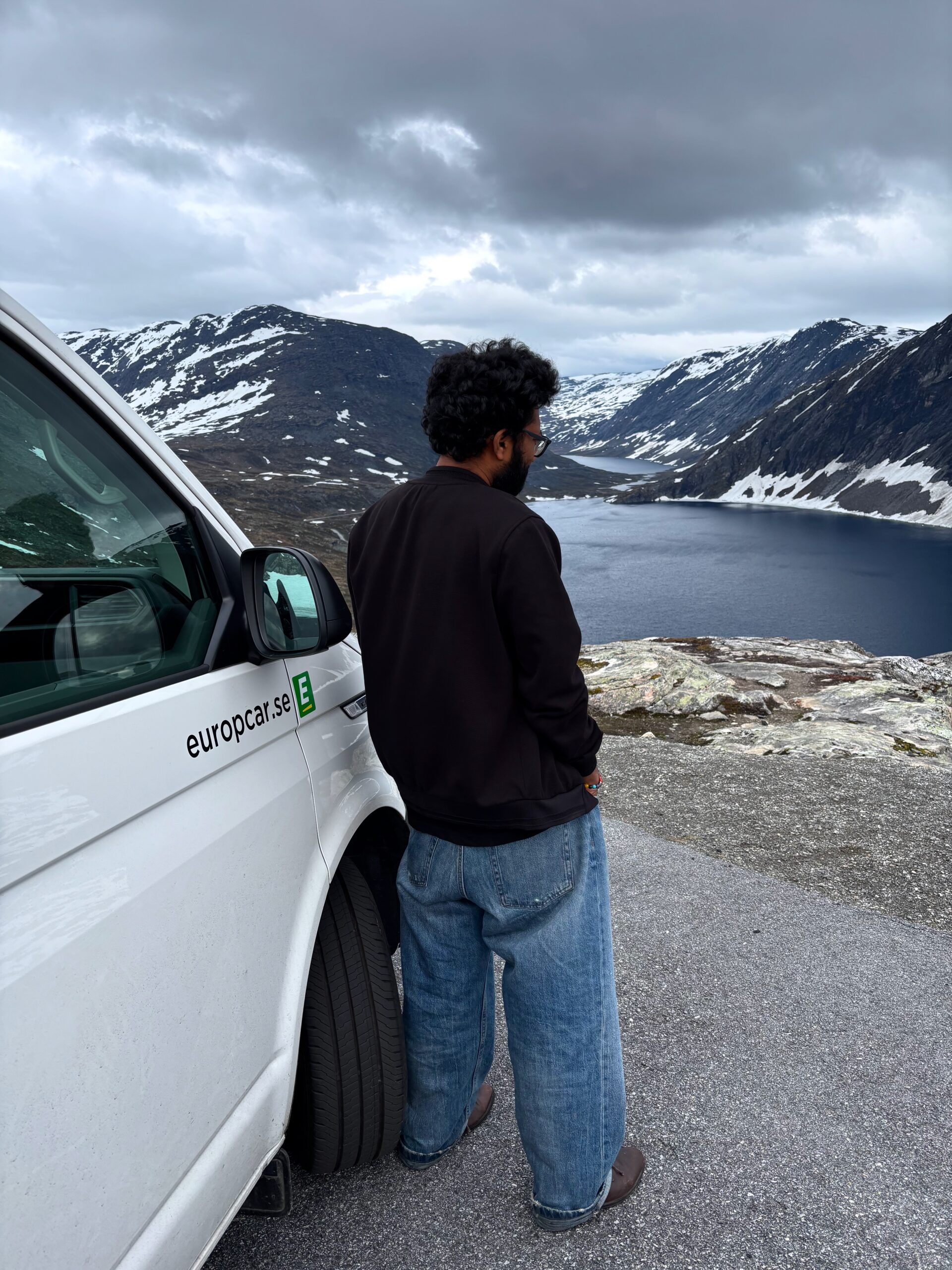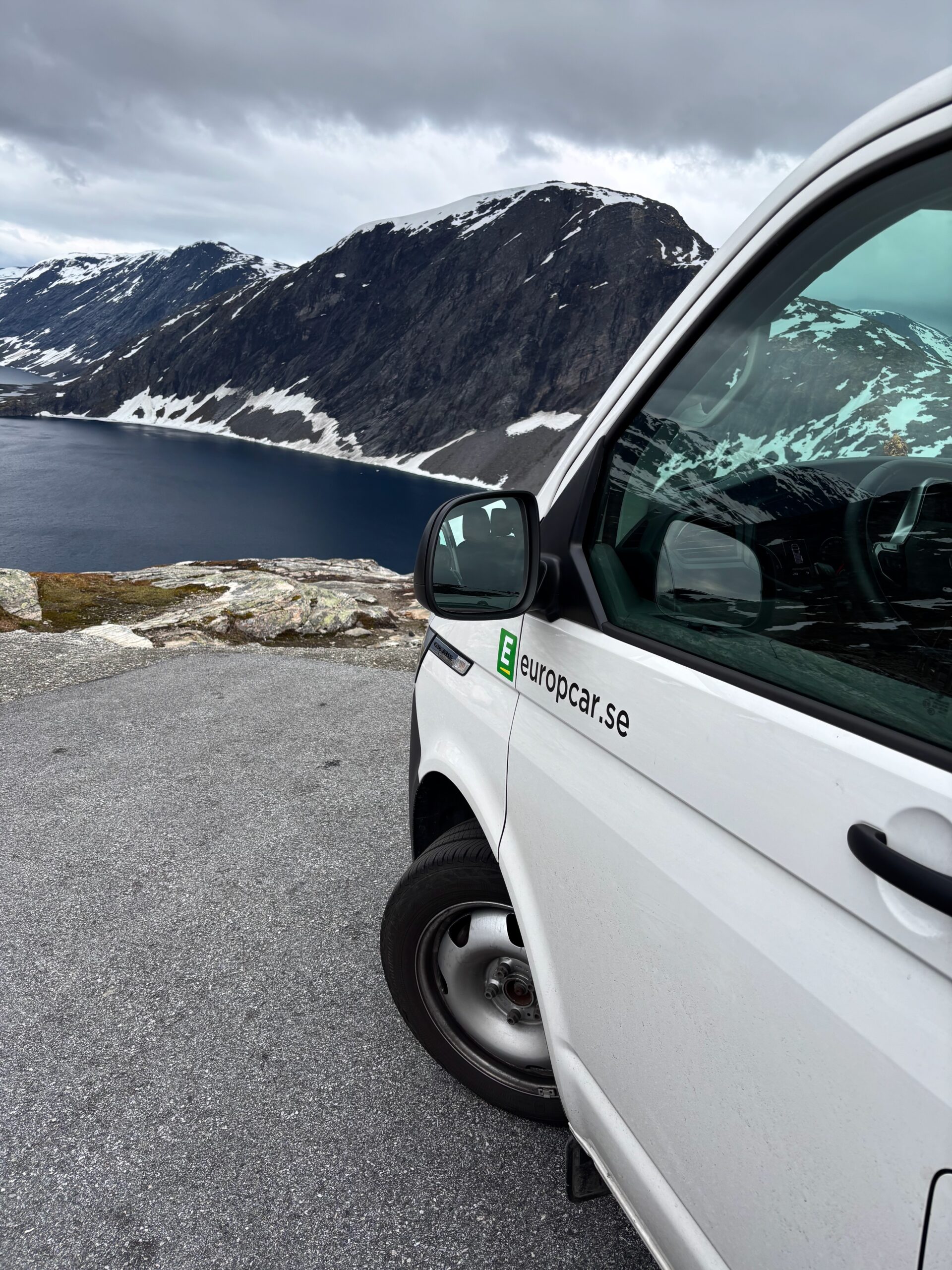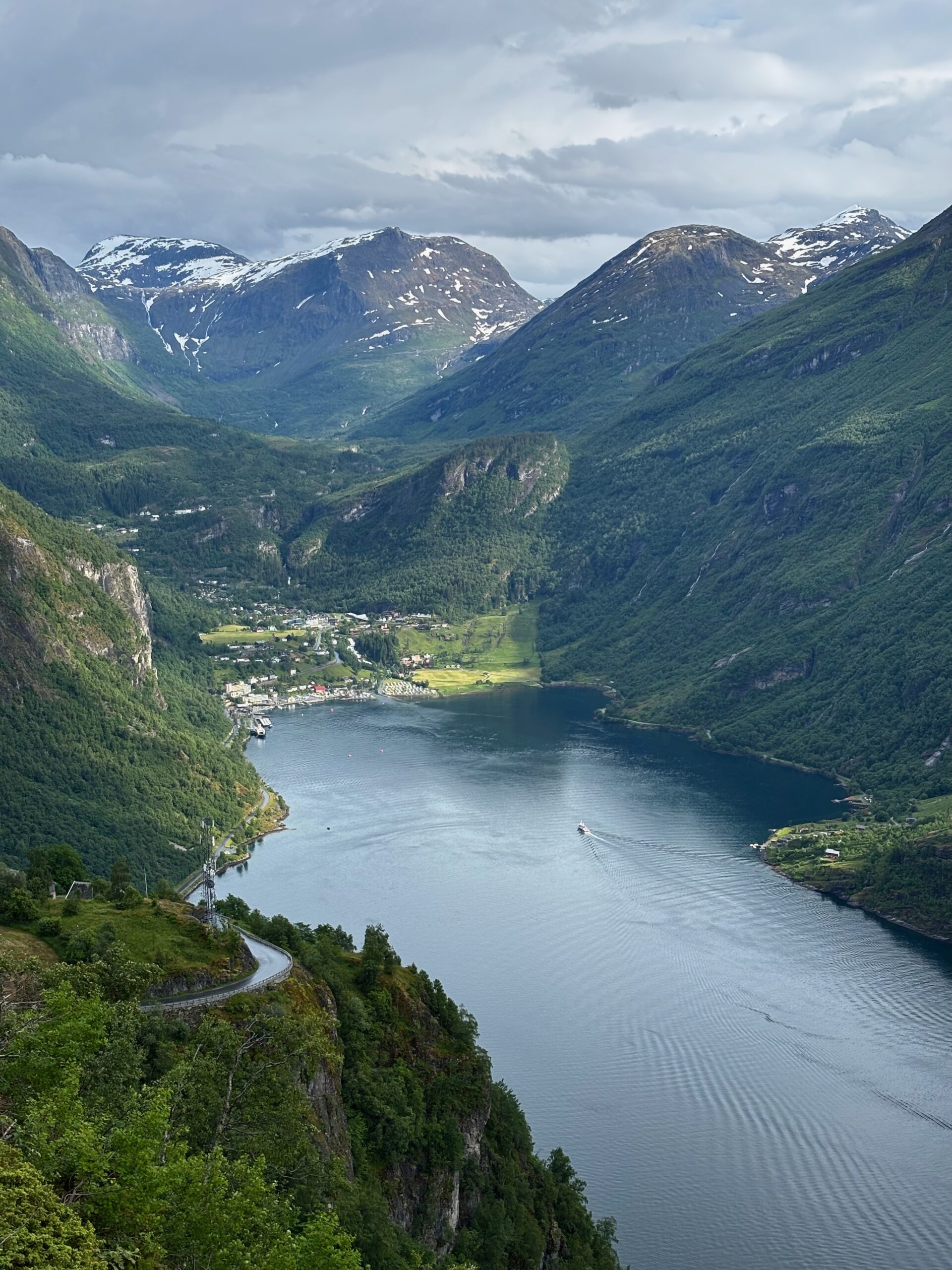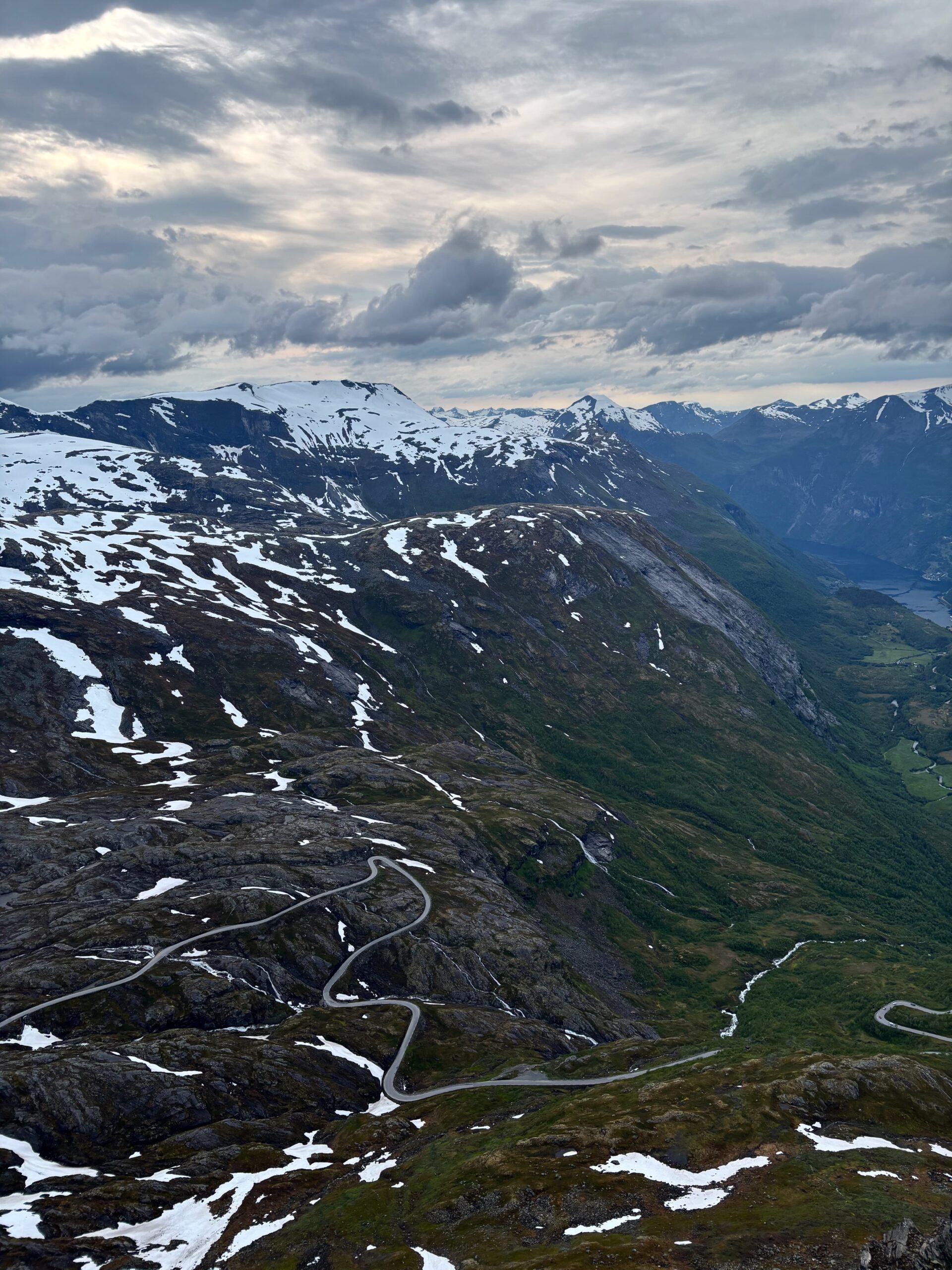 The journey north continued into postcard territory. Driving the Eagle Road, we climbed hairpin bends with panoramic views at every turn, stopping for photos at the breathtaking Eagle Bend Viewpoint. Higher still, we reached Dalsnibba, where snowy peaks rose above a deep blue lake, glistening in the late evening sun.