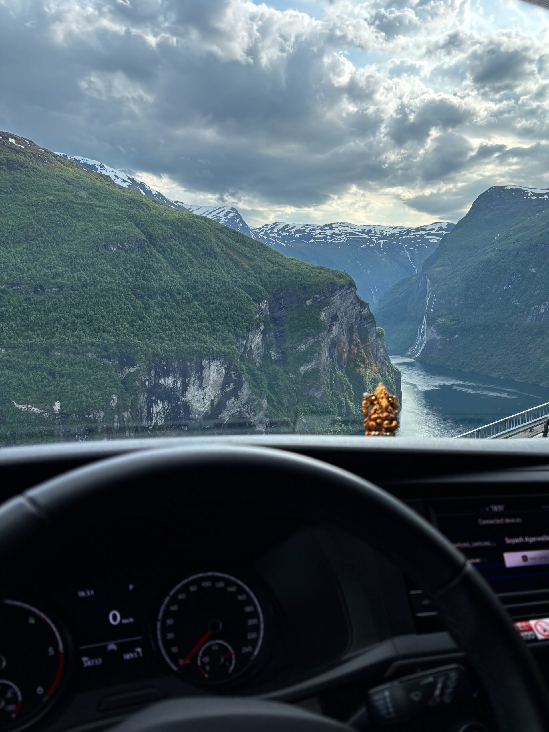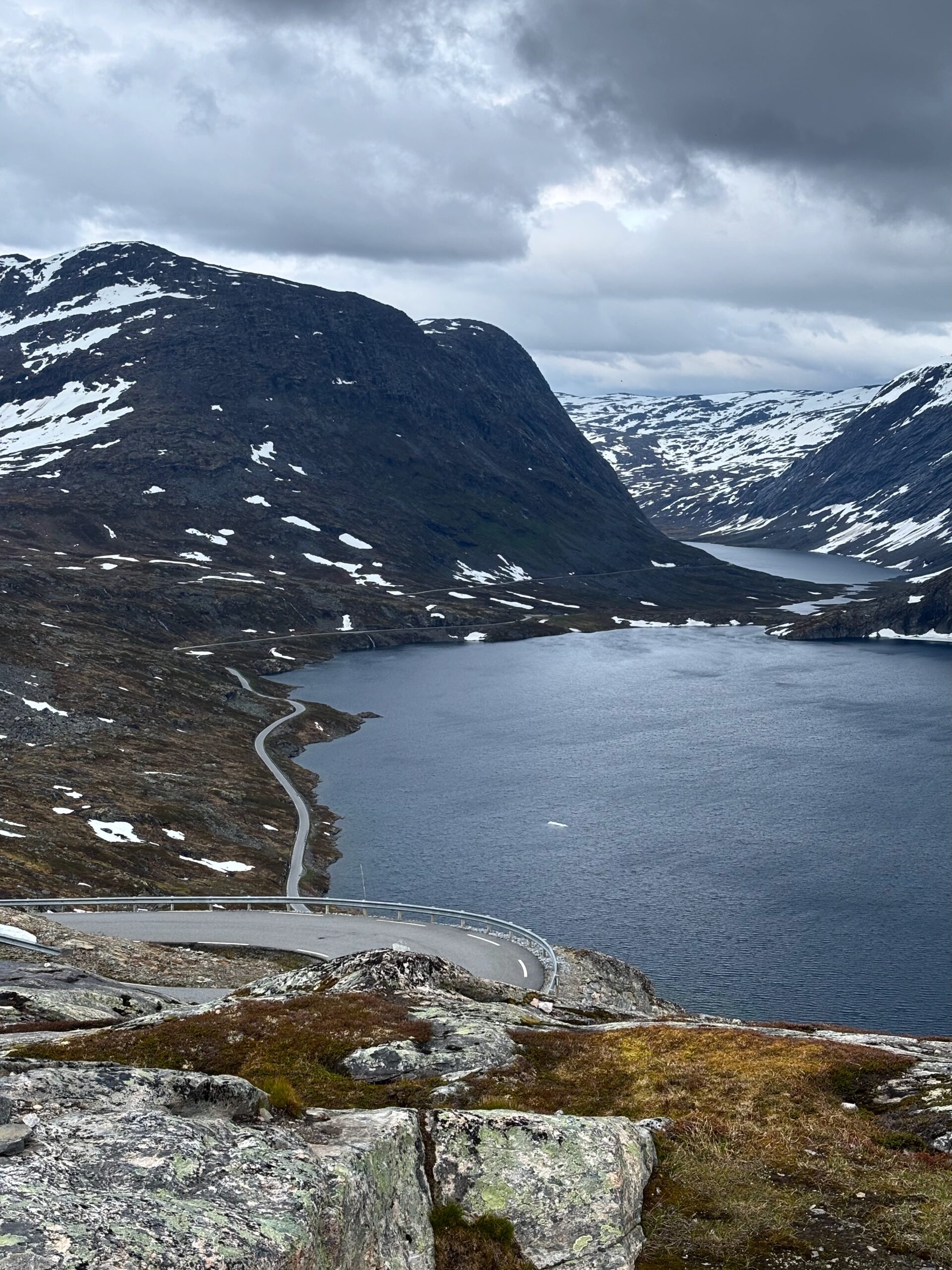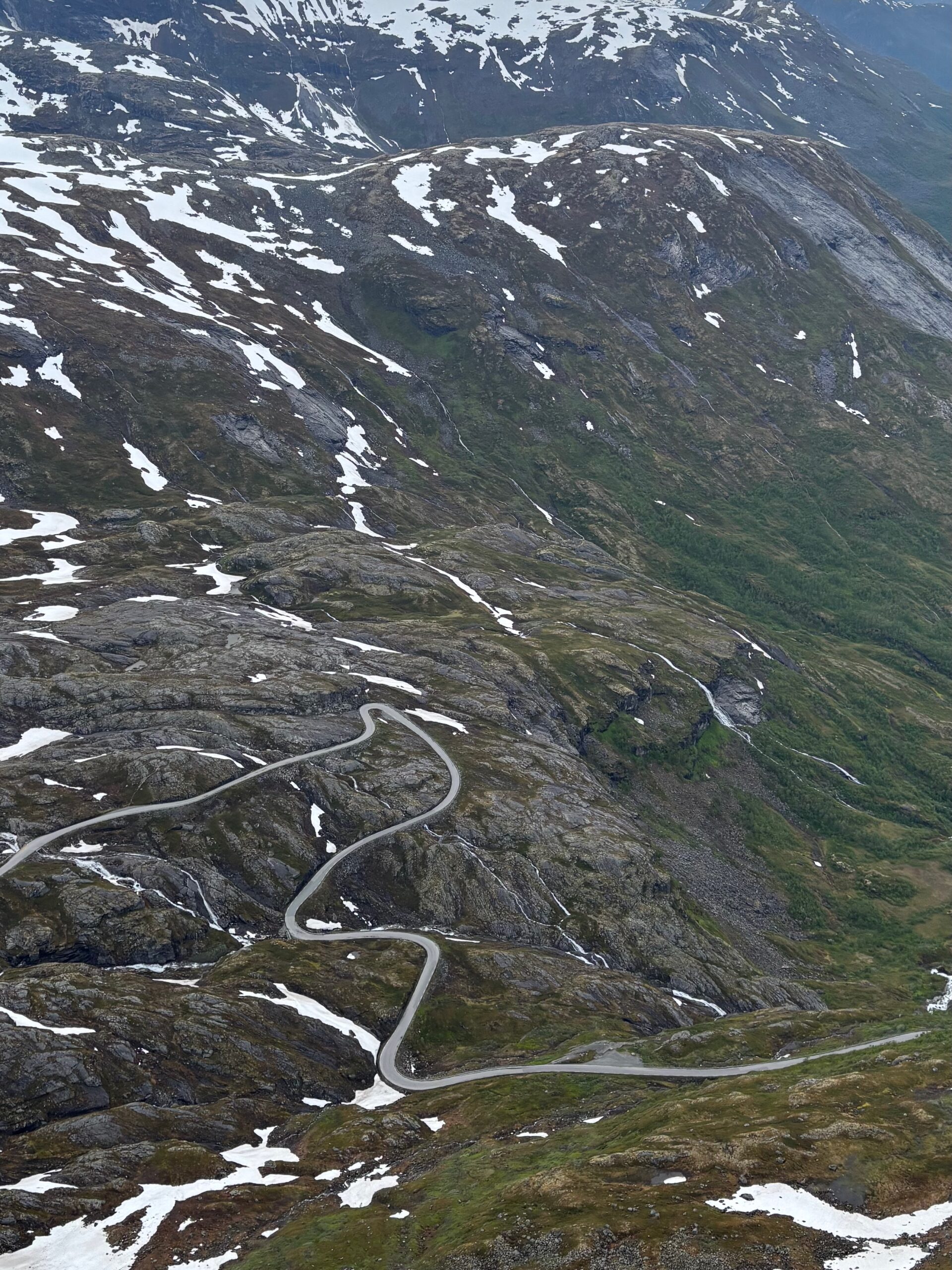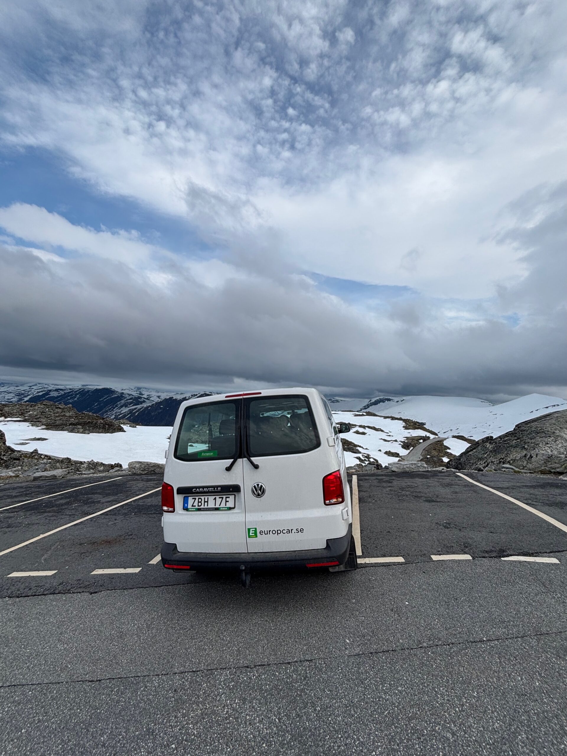 The journey north continued into postcard territory. Driving the Eagle Road, we climbed hairpin bends with panoramic views at every turn, stopping for photos at the breathtaking Eagle Bend Viewpoint. Higher still, we reached Dalsnibba, where snowy peaks rose above a deep blue lake, glistening in the late evening sun.