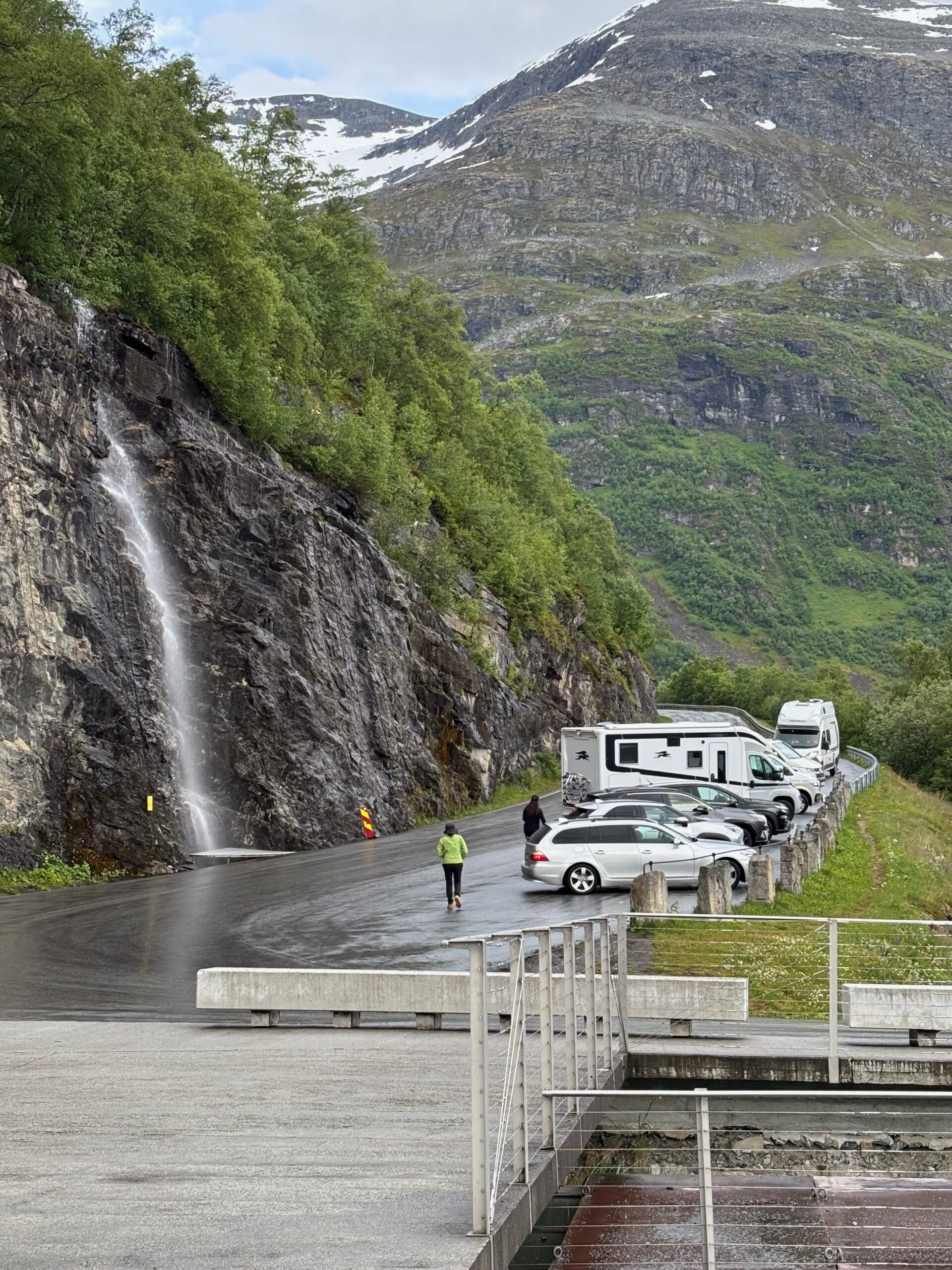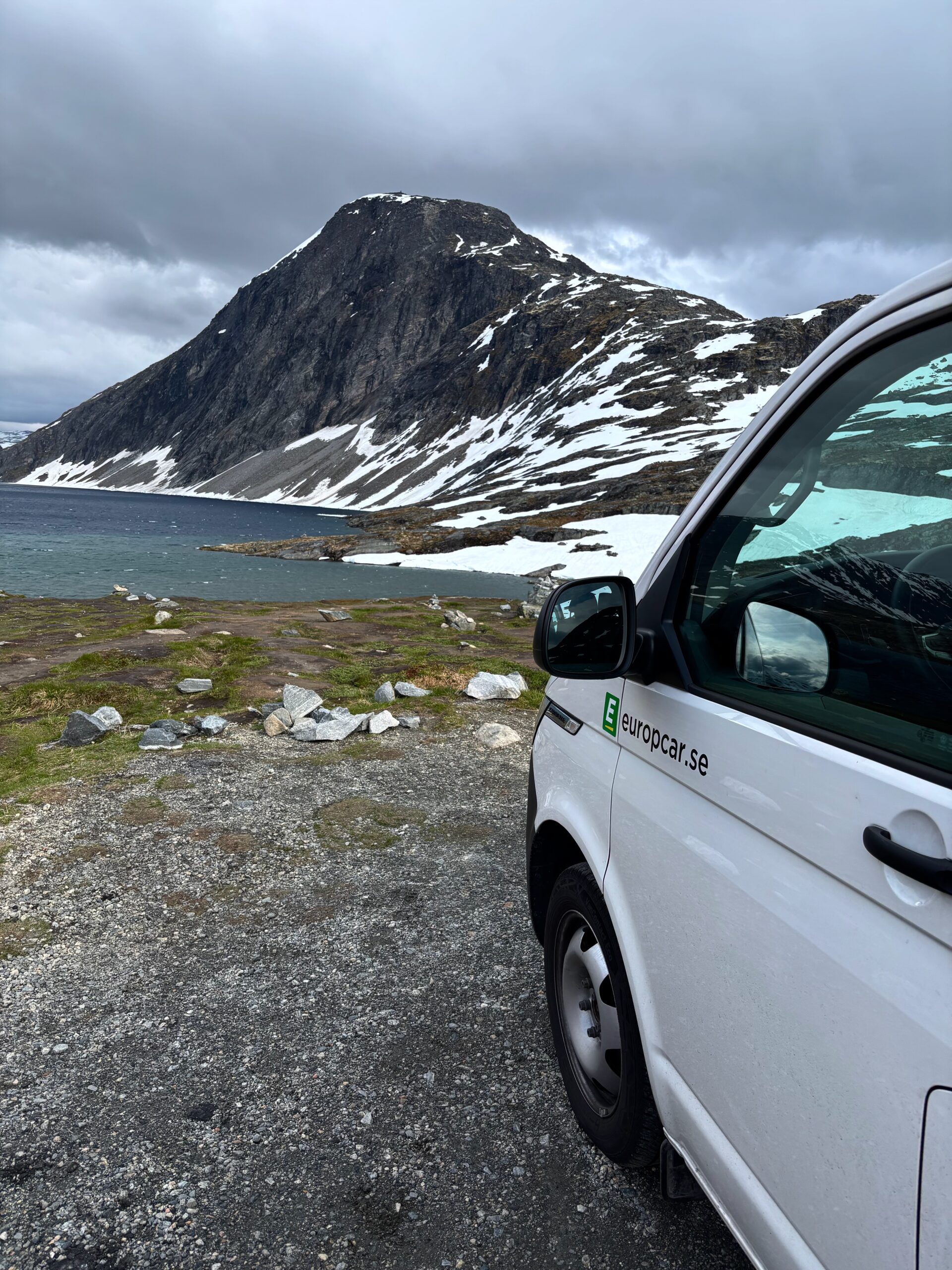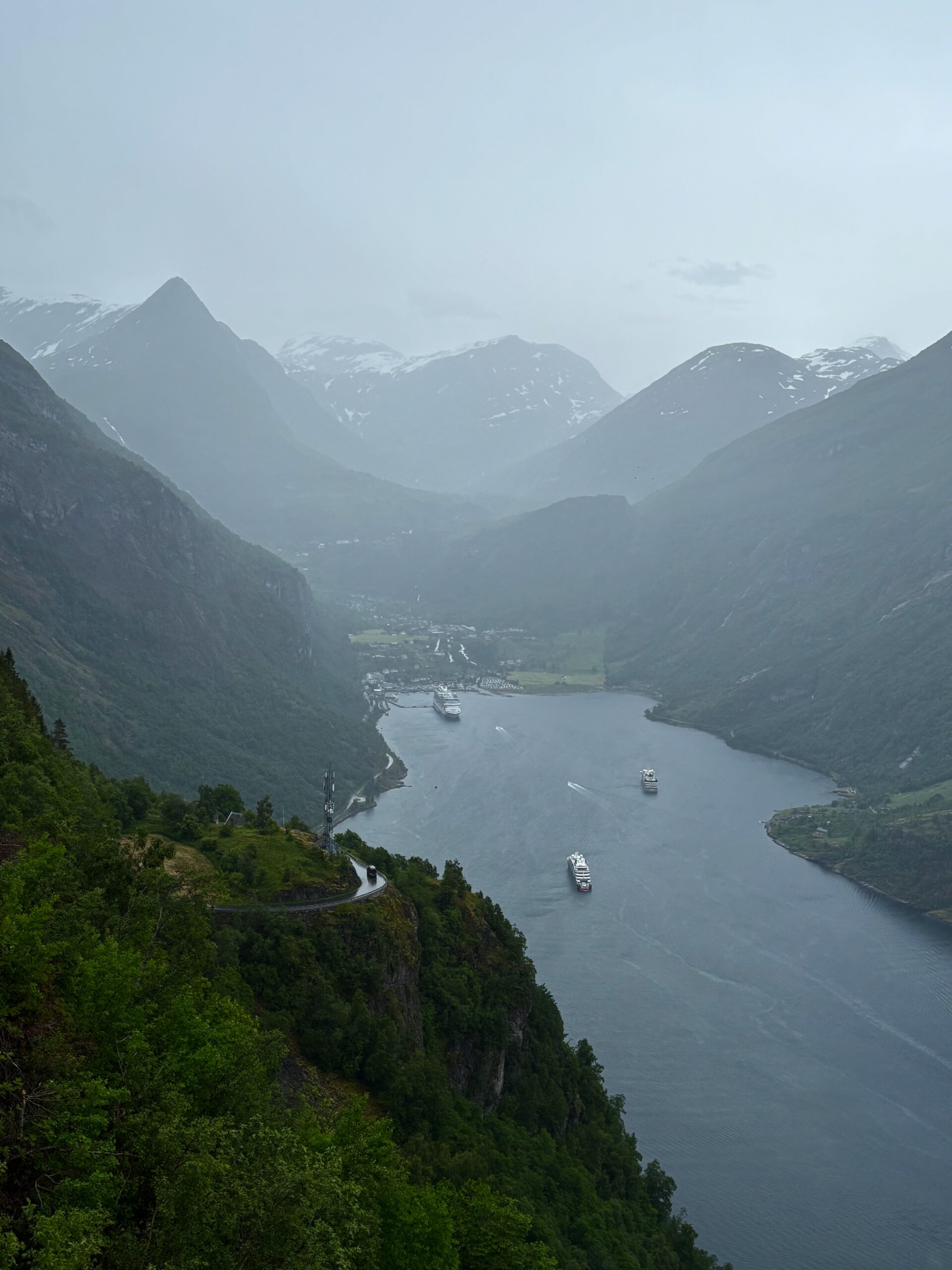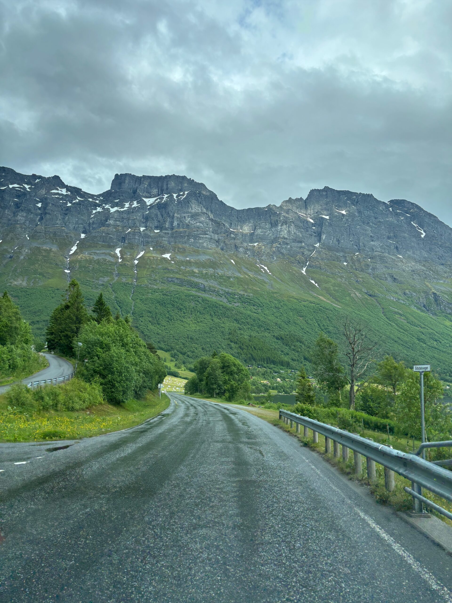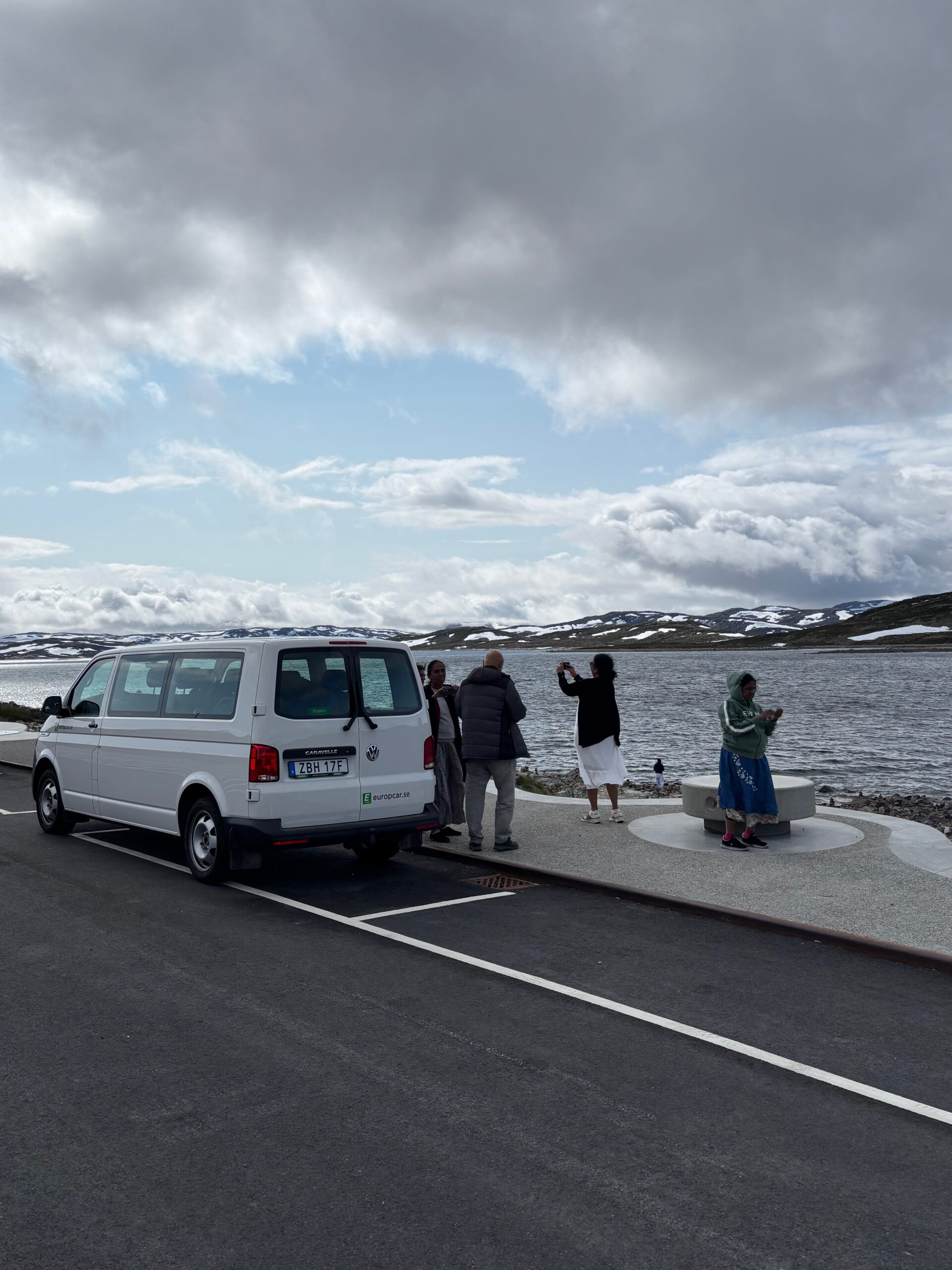 The journey north continued into postcard territory. Driving the Eagle Road, we climbed hairpin bends with panoramic views at every turn, stopping for photos at the breathtaking Eagle Bend Viewpoint. Higher still, we reached Dalsnibba, where snowy peaks rose above a deep blue lake, glistening in the late evening sun.