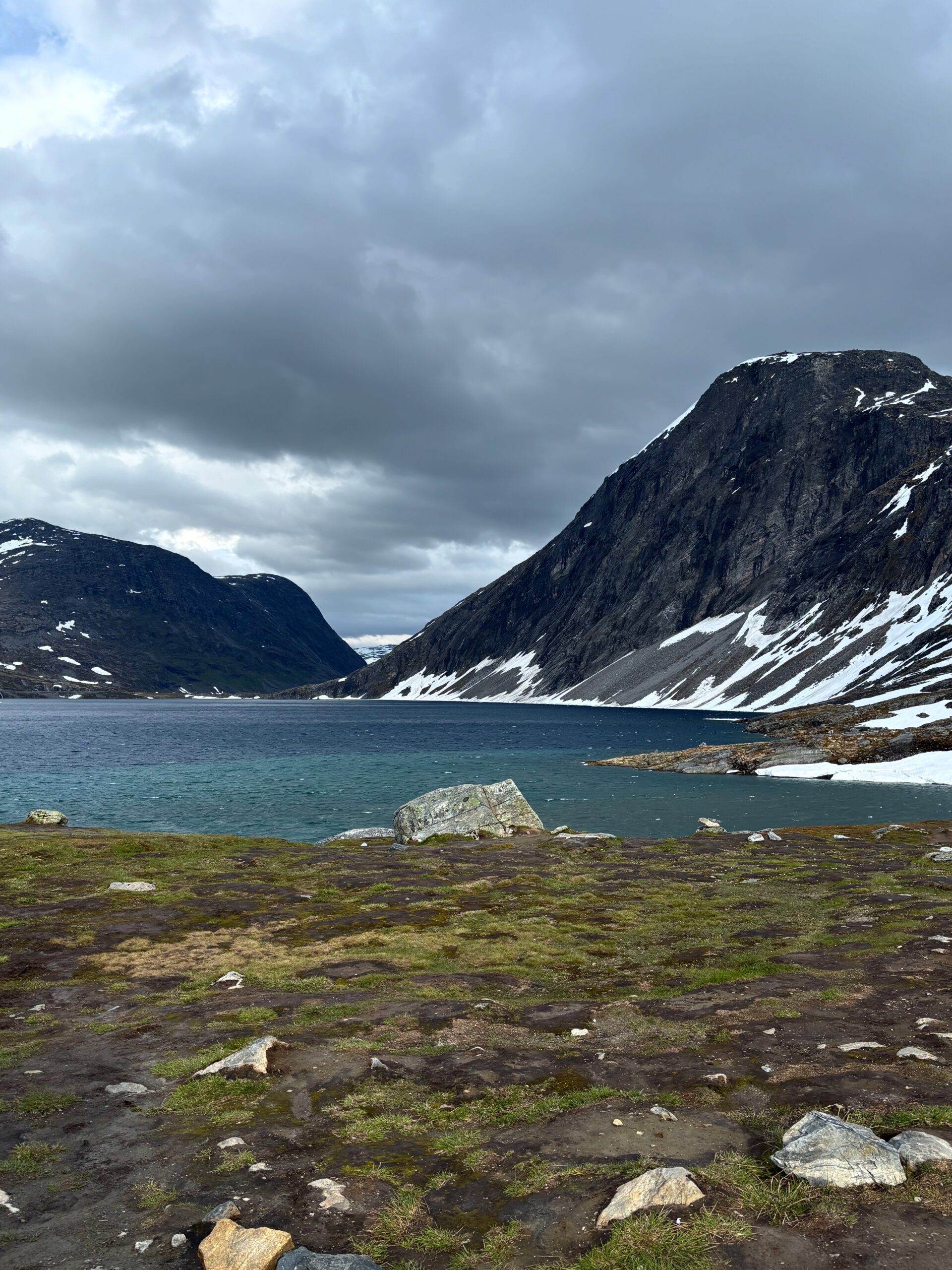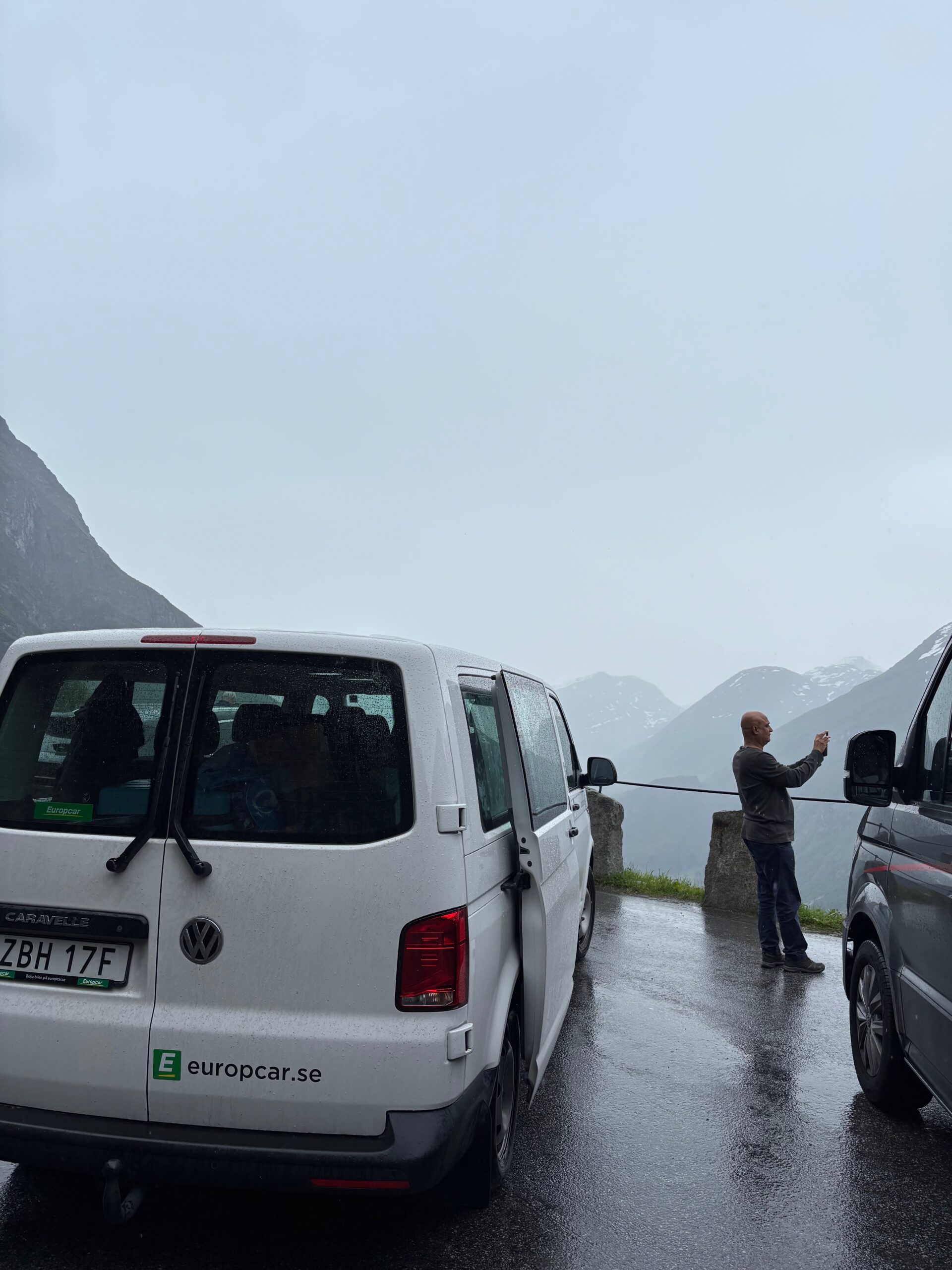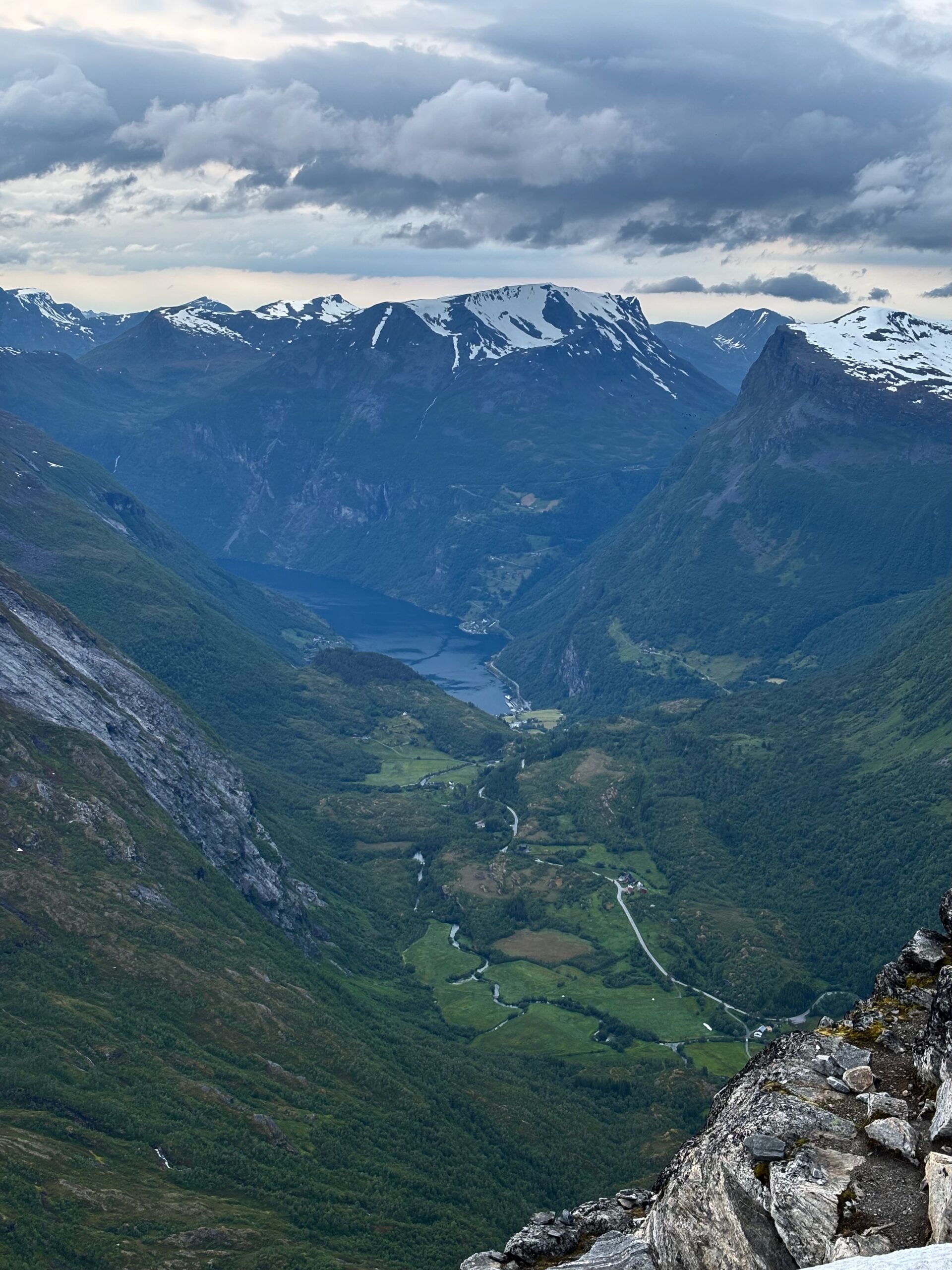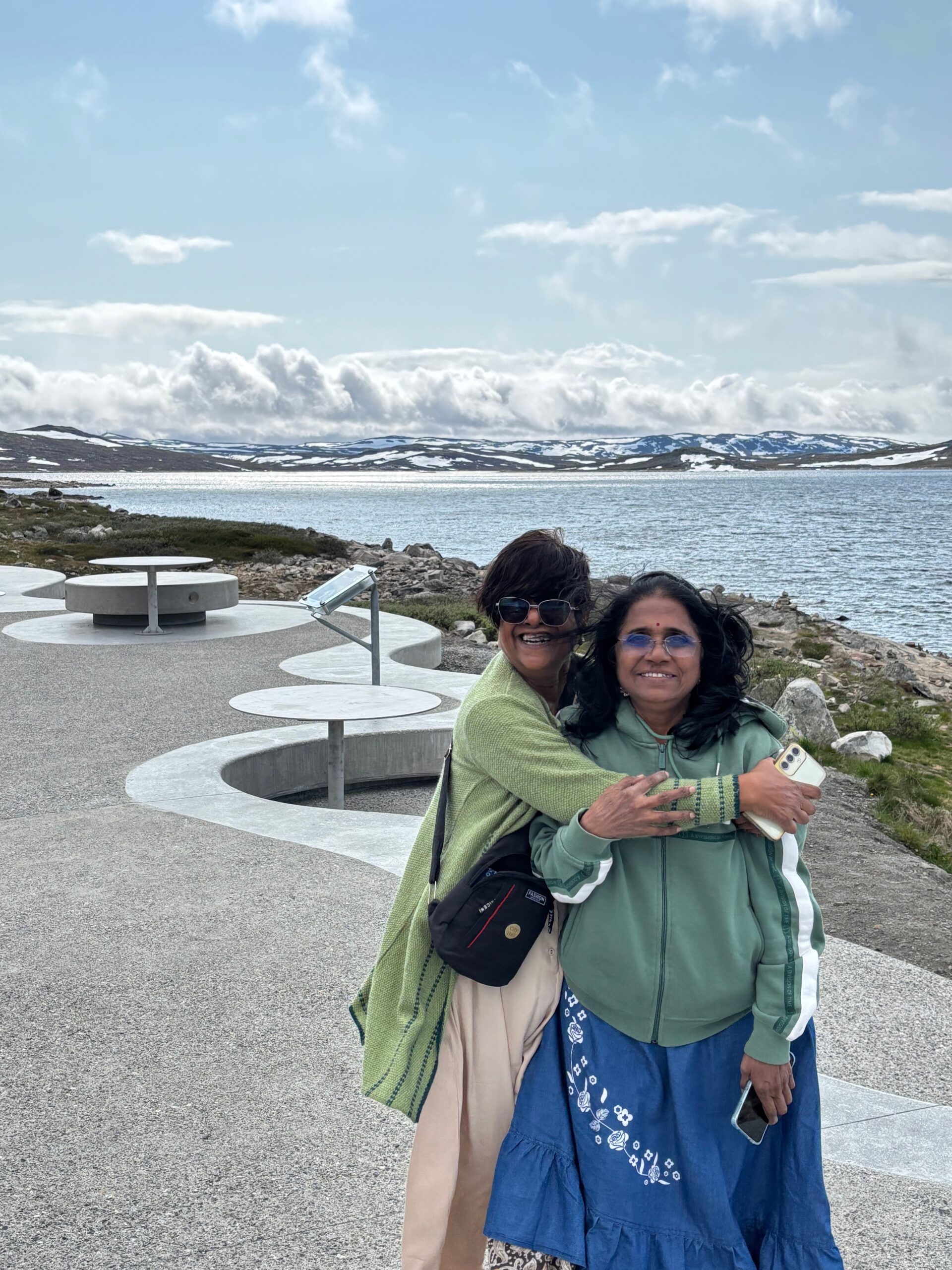 The journey north continued into postcard territory. Driving the Eagle Road, we climbed hairpin bends with panoramic views at every turn, stopping for photos at the breathtaking Eagle Bend Viewpoint. Higher still, we reached Dalsnibba, where snowy peaks rose above a deep blue lake, glistening in the late evening sun.