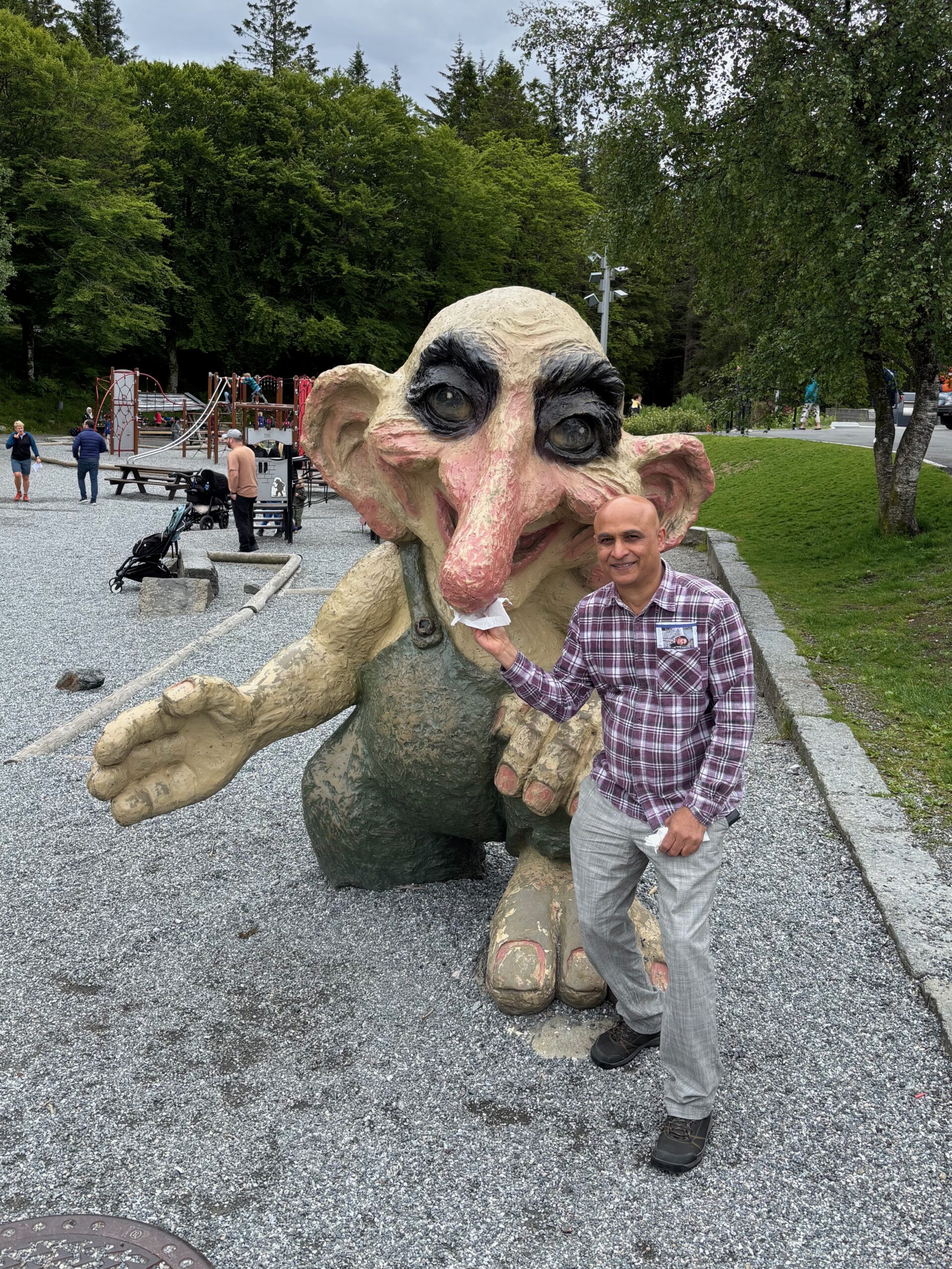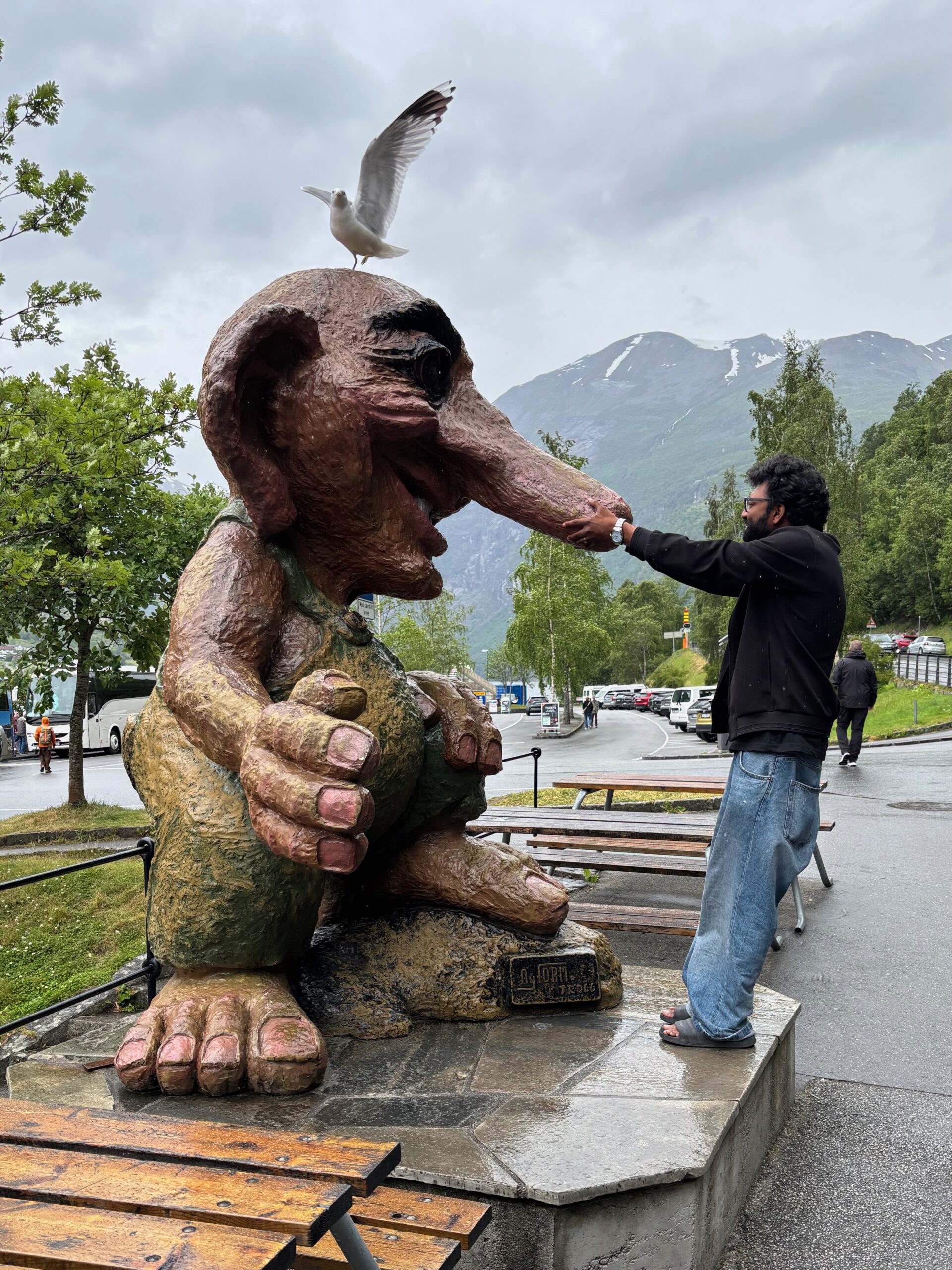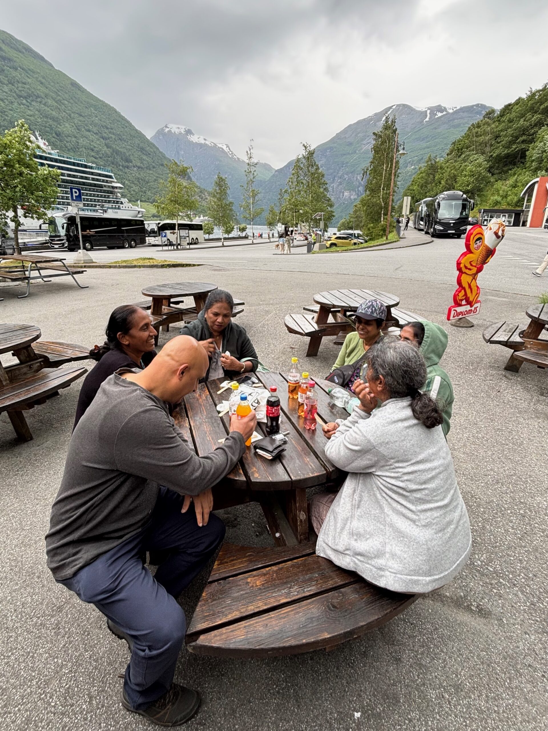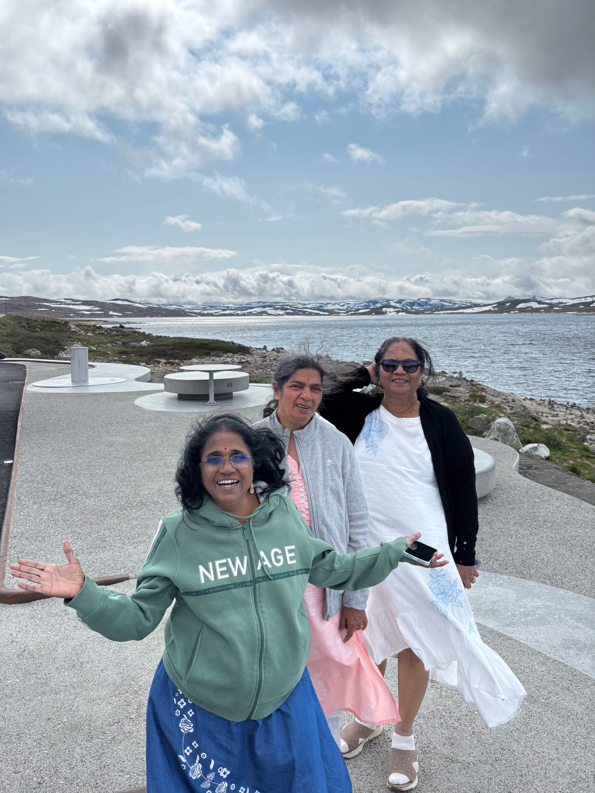 The journey north continued into postcard territory. Driving the Eagle Road, we climbed hairpin bends with panoramic views at every turn, stopping for photos at the breathtaking Eagle Bend Viewpoint. Higher still, we reached Dalsnibba, where snowy peaks rose above a deep blue lake, glistening in the late evening sun.