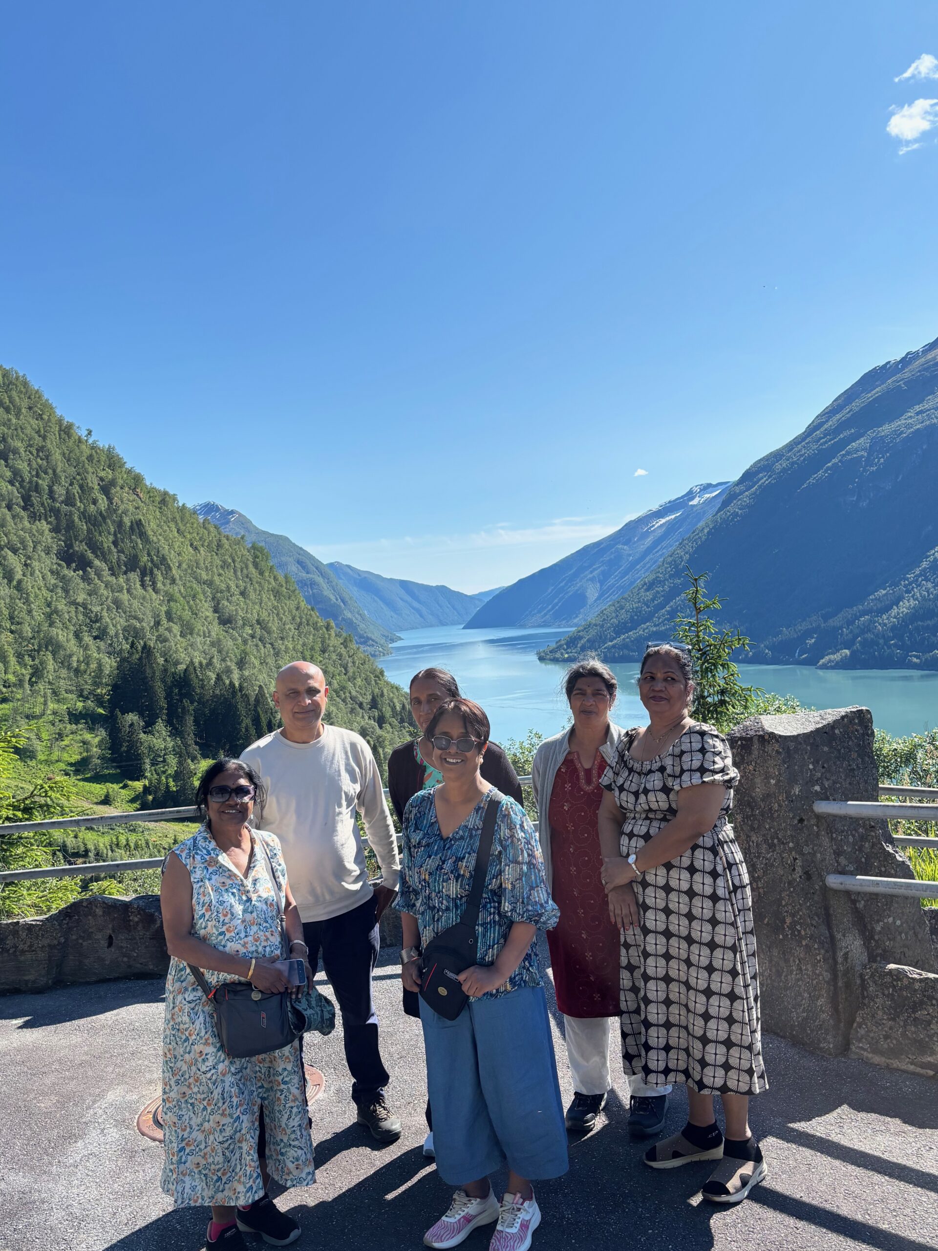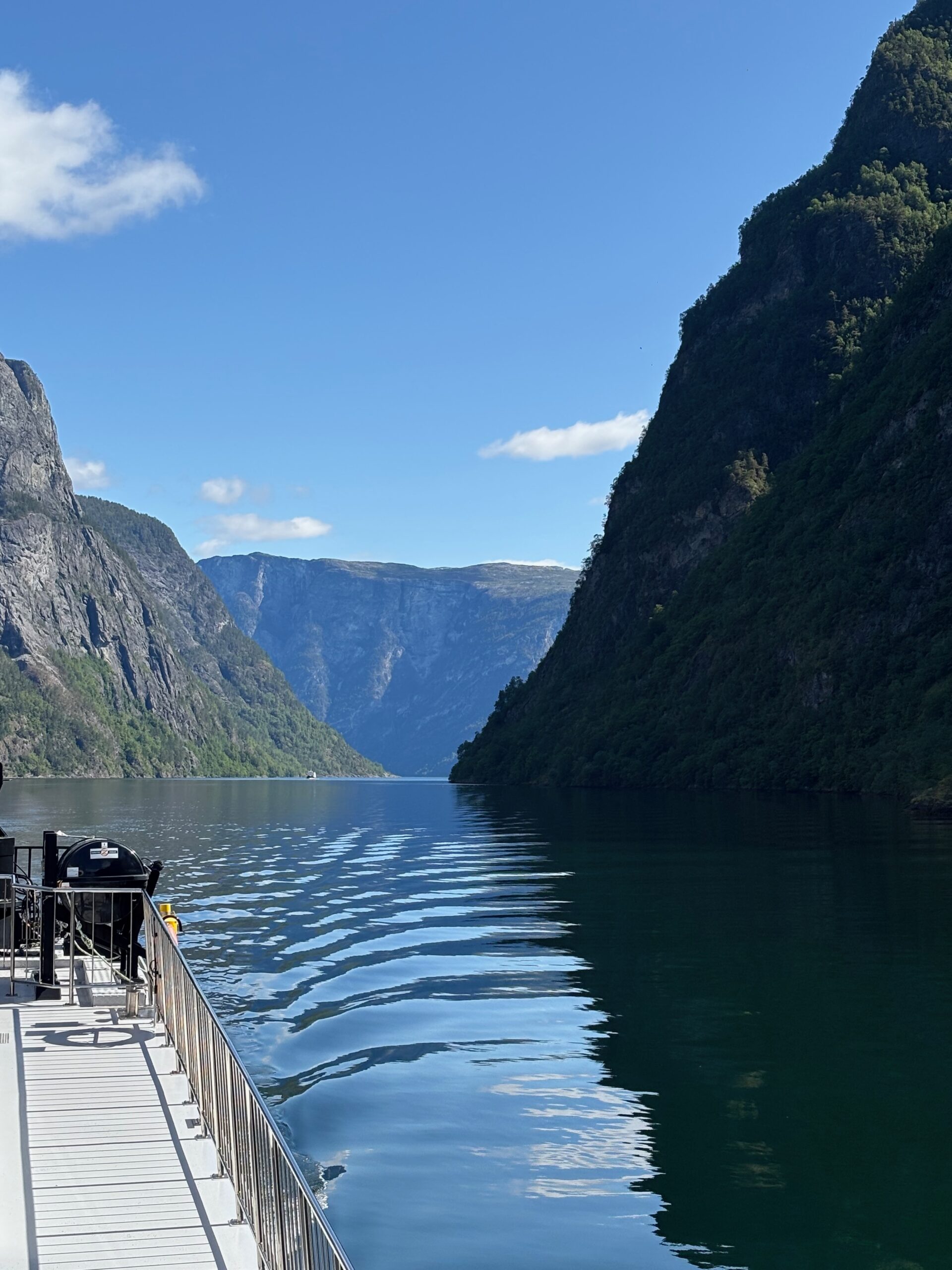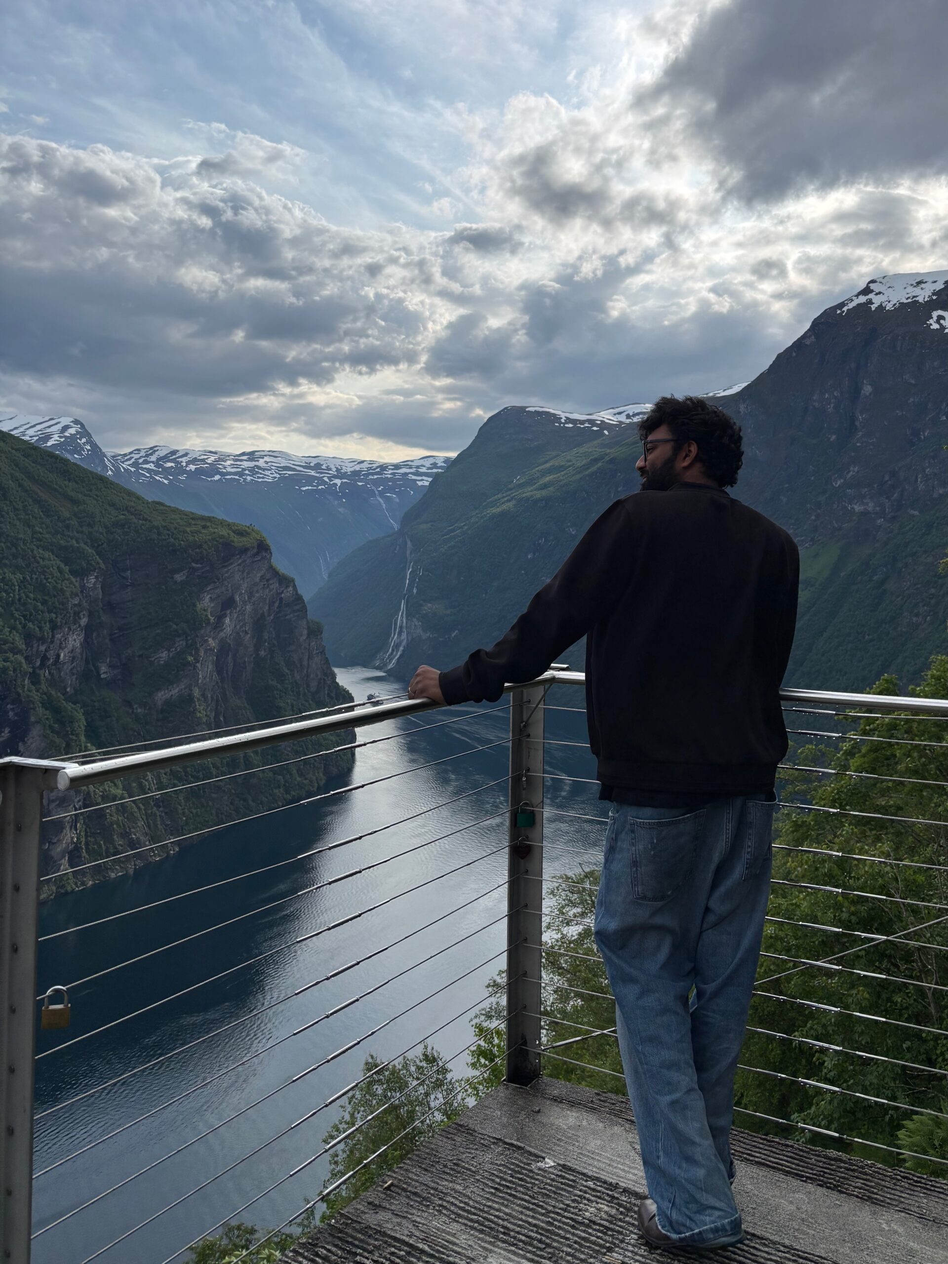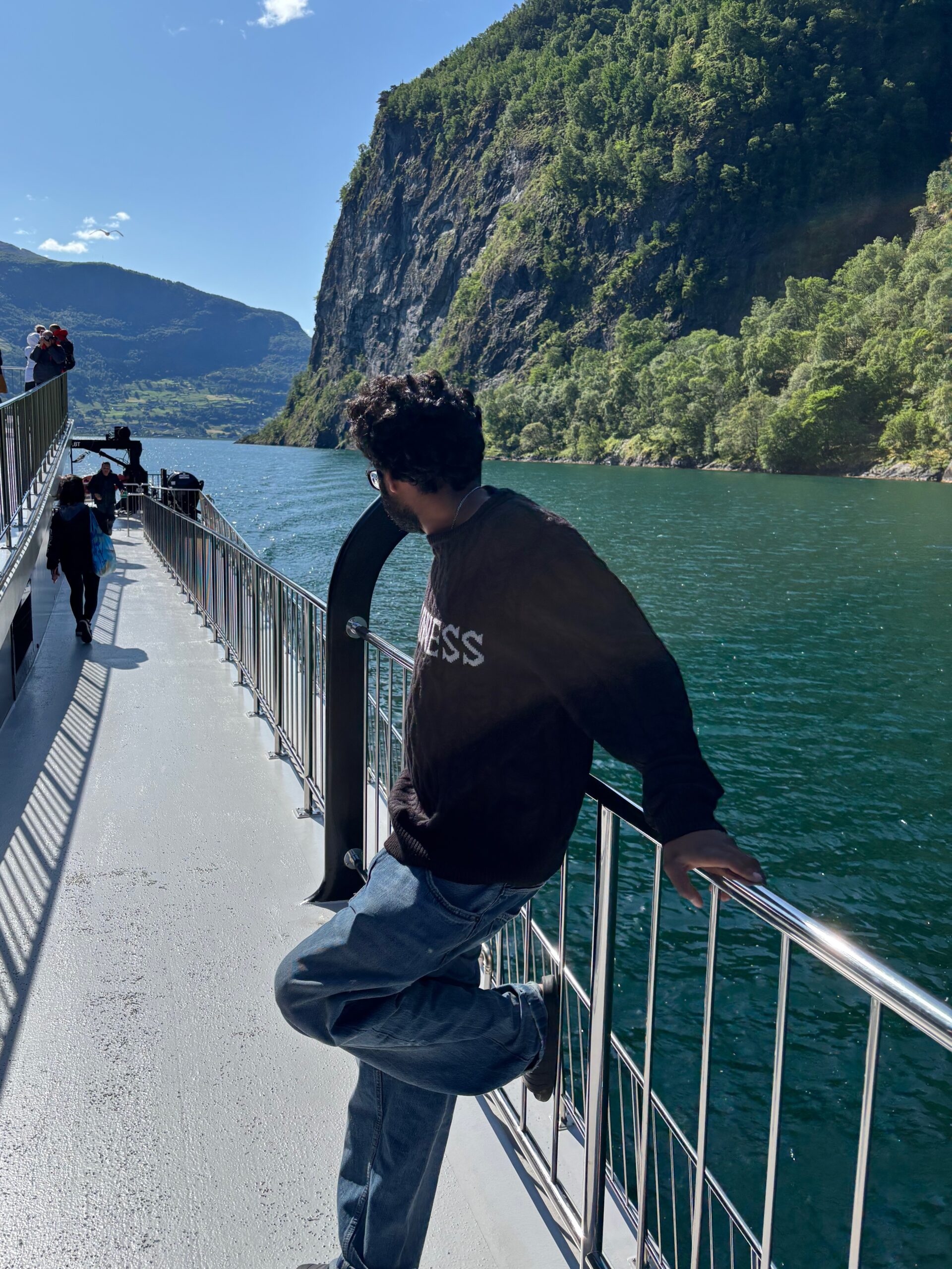 Next, we drove west to Bergen, the city of seven mountains, where colorful harbors and sea-salt air framed our days. From there, we moved to the tranquil valley of Flåm, nestled between steep cliffs and cascading waterfalls. Our countryside stay felt like a dream. A cruise through the Nærøyfjord, one of Norway’s most dramatic and narrow fjords, left us floating through a landscape carved by time. At the Stegastein Viewpoint, we stood high above the fjord, suspended in silence, surrounded by clouds and space.