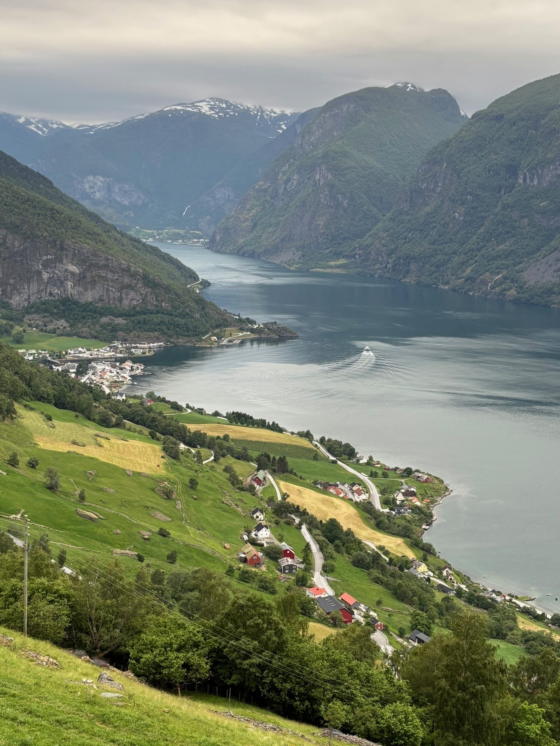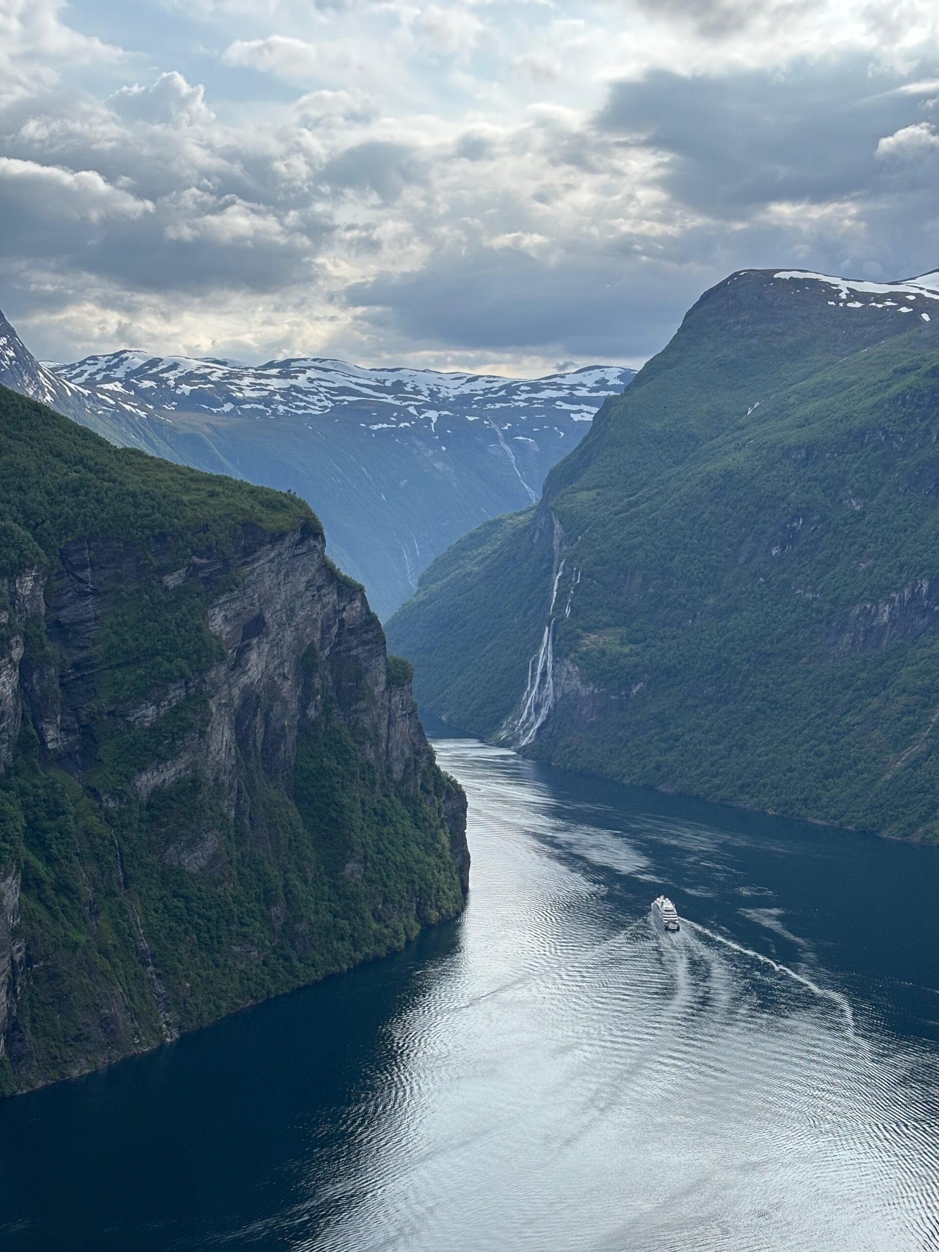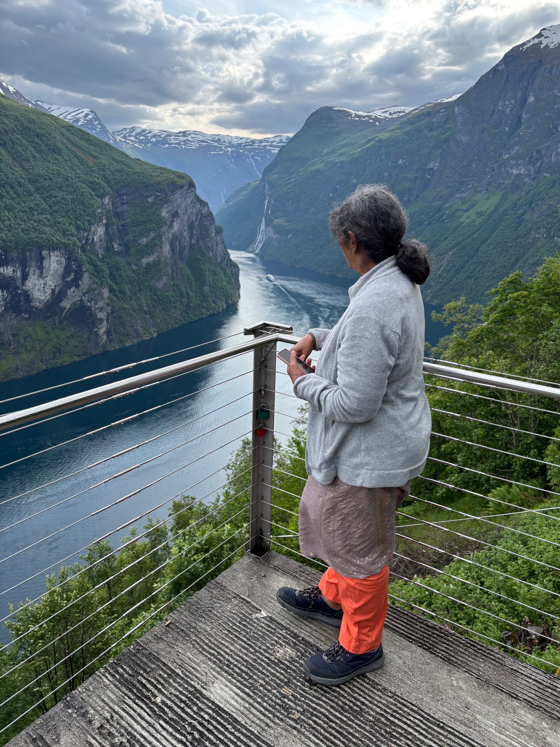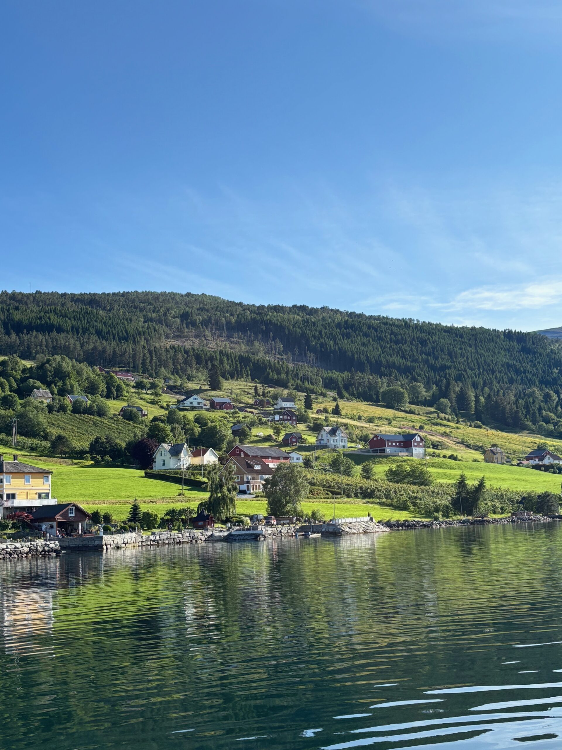 Next, we drove west to Bergen, the city of seven mountains, where colorful harbors and sea-salt air framed our days. From there, we moved to the tranquil valley of Flåm, nestled between steep cliffs and cascading waterfalls. Our countryside stay felt like a dream. A cruise through the Nærøyfjord, one of Norway’s most dramatic and narrow fjords, left us floating through a landscape carved by time. At the Stegastein Viewpoint, we stood high above the fjord, suspended in silence, surrounded by clouds and space.