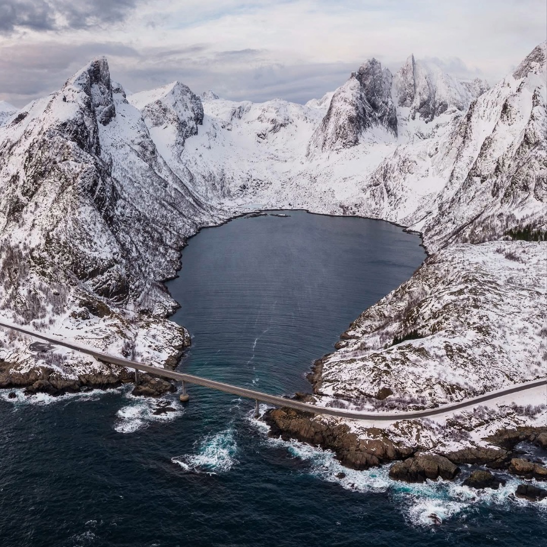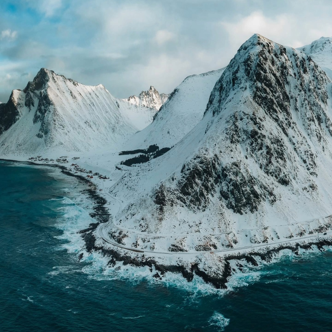 The scenery up there is insane. You’ve got massive snow-covered mountains that basically fall right into the ocean, crystal-clear fjords that look fake, and tiny fishing villages that look like movie sets. Every few minutes on the road you’ll wanna pull over for photos because it’s just that good. The light in March is wild too — soft, golden, and makes everything look crisp. It’s not all postcard-perfect calm either; sometimes you get wild weather, moody skies, and crashing waves.
