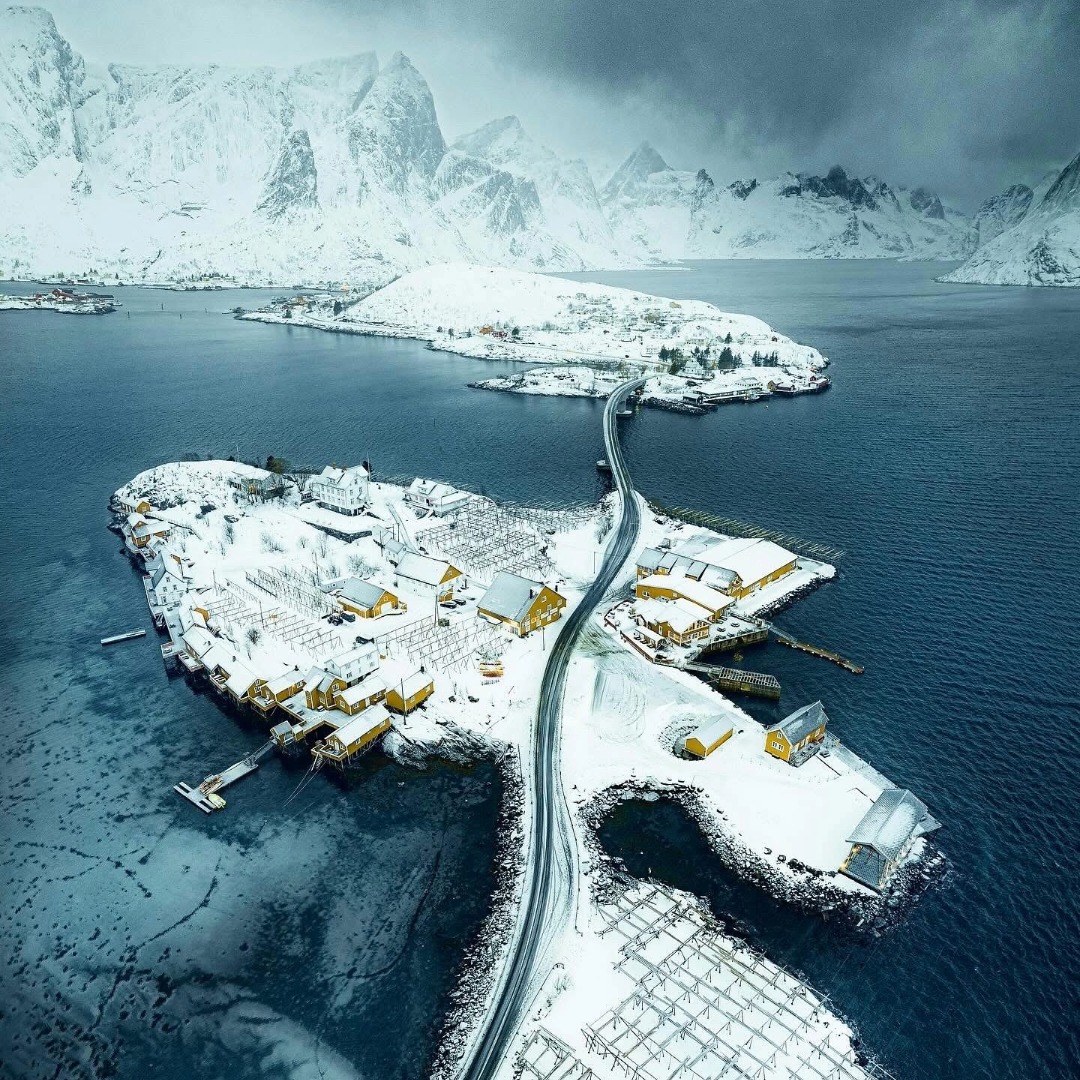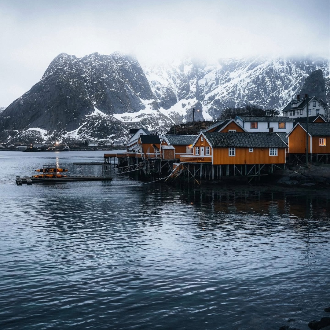 Winter in the Lofoten Islands is a dramatic symphony of light and landscape. Snow-dusted peaks plunge into icy fjords, red fishing cabins glow against the blue twilight, and the air feels crisp and pure. Storms sweep in from the Norwegian Sea, painting the skies with fleeting bursts of color, while calm nights reveal shimmering Northern Lights dancing above still waters. Days are short but luminous, with soft pastel hues stretching across the horizon.