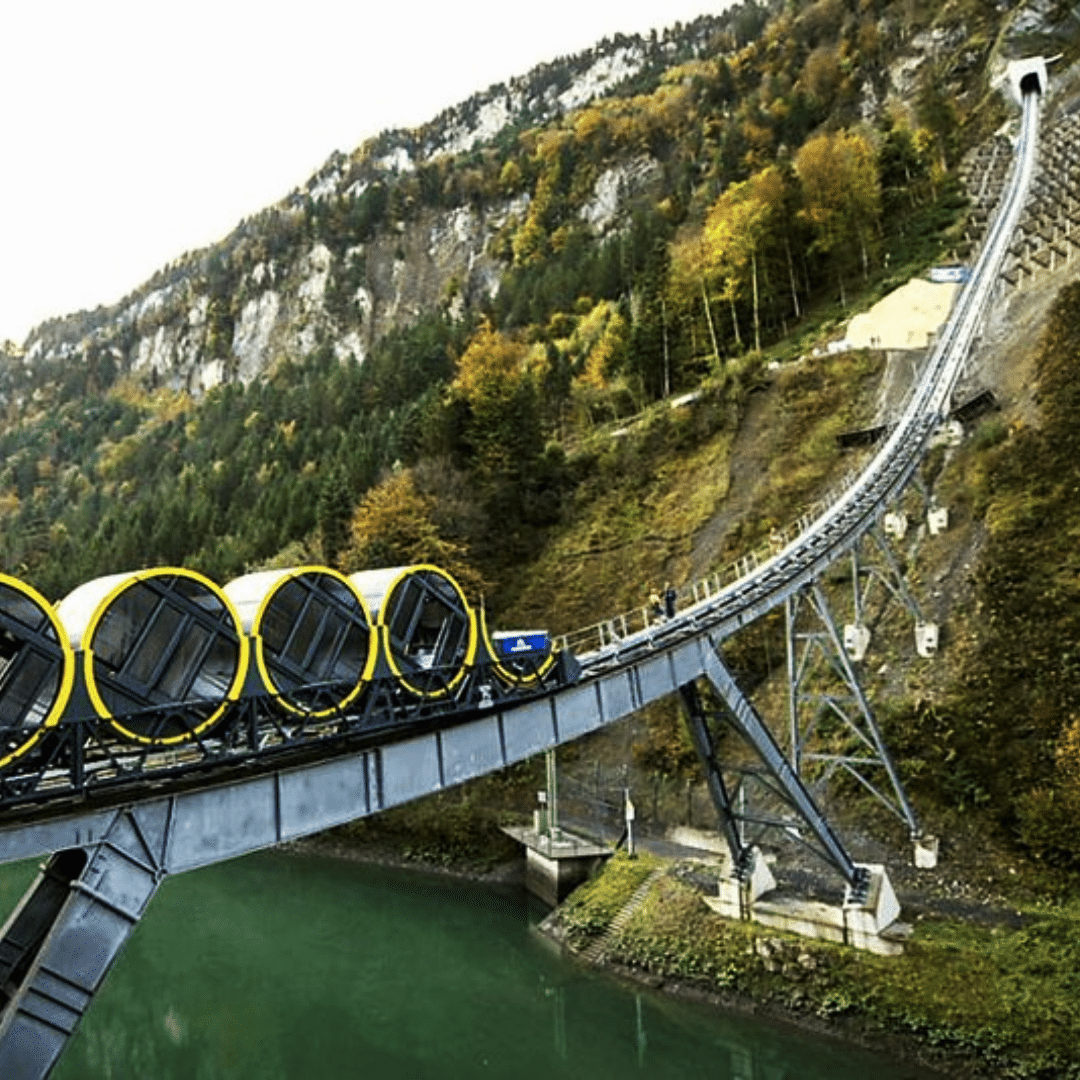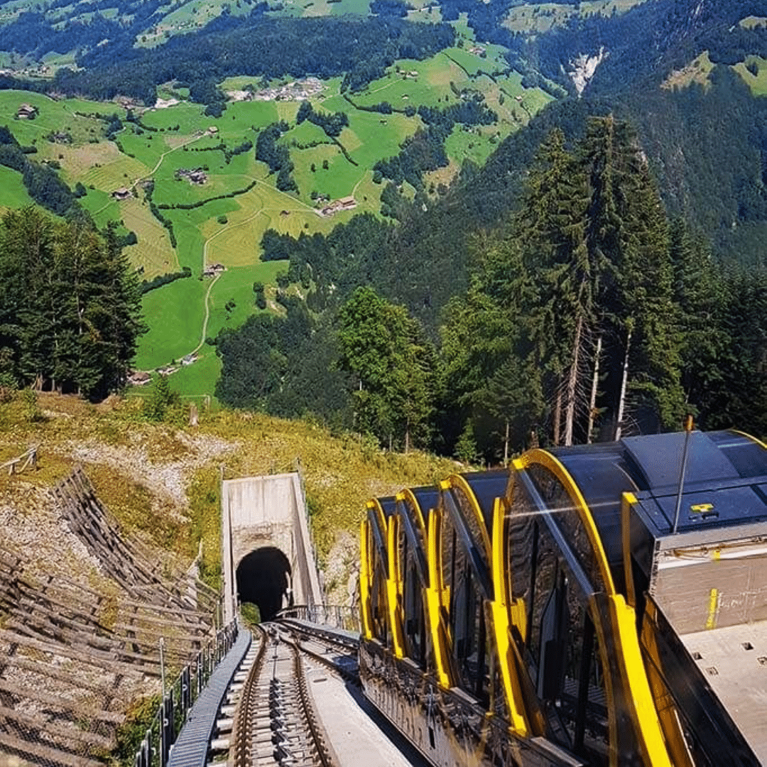 At the very heart of Switzerland, a world record-holding technical innovation awaits: the steepest funicular railway in the world leads from Schwyz up to the car-free mountain village of Stoos. The journey there is an experience in itself. The Stoosbahn reaches a gradient of 110% (47 degrees)