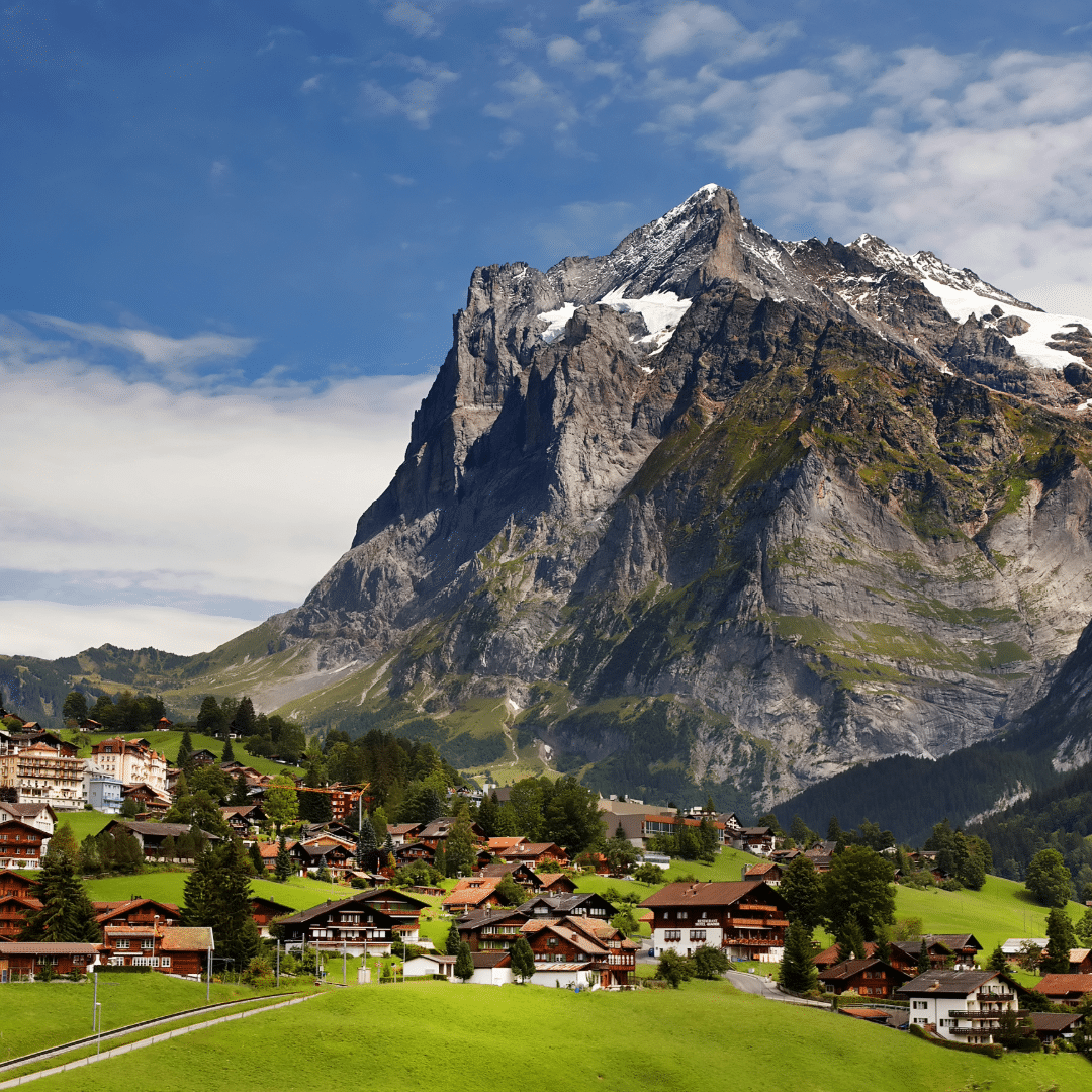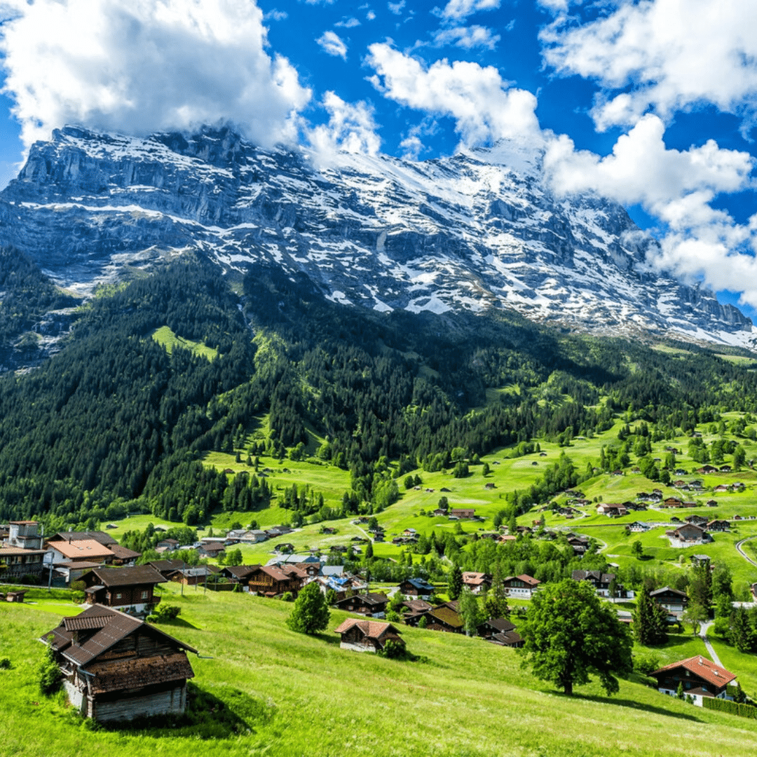 The Eiger village of Grindelwald in the Bernese Oberland lies embedded in a welcoming and green hollow, surrounded by a commanding mountainscape with the Eiger north face and the Wetterhorn.
